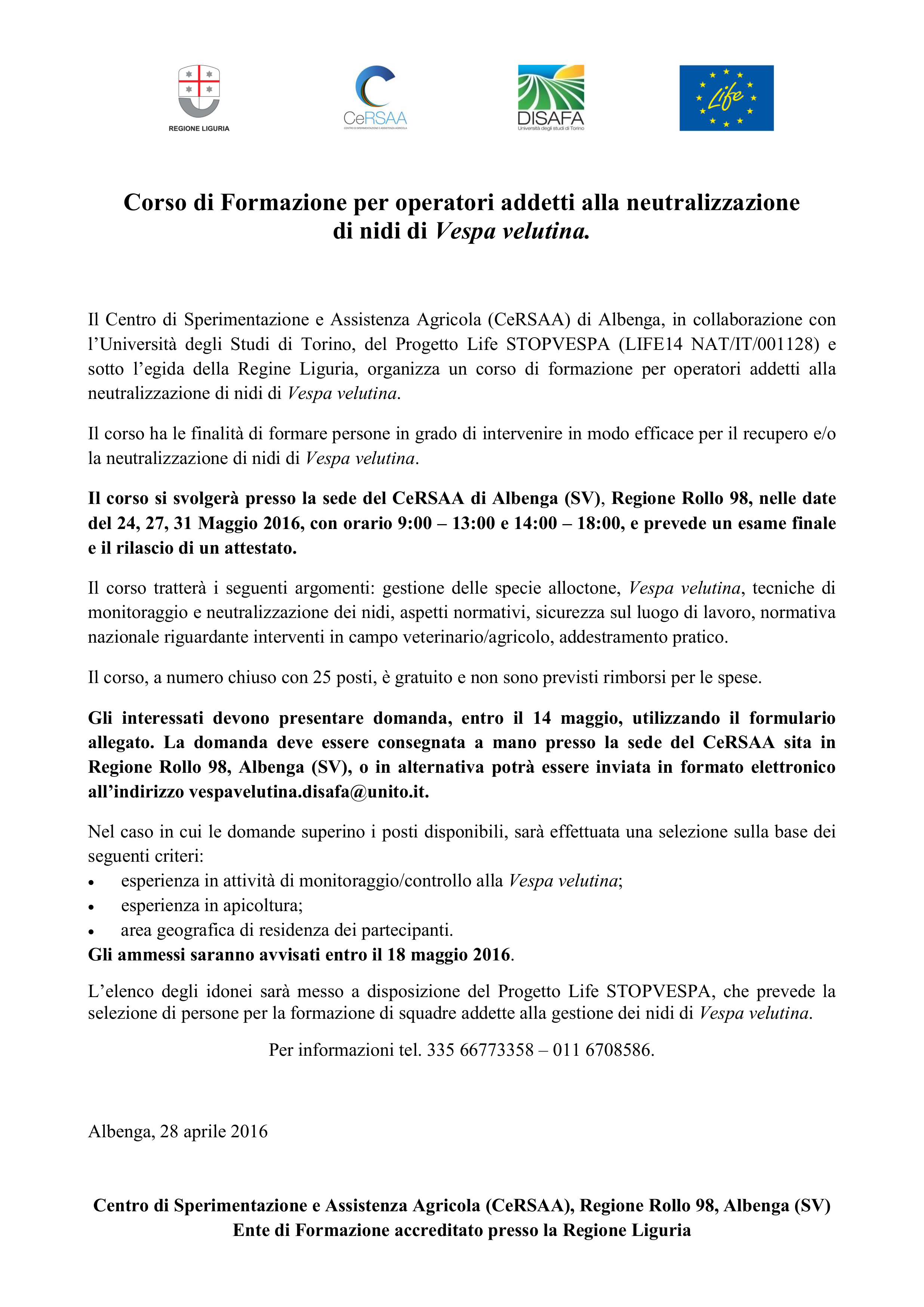 Il Centro di sperimentazione e assistenza agricola di Albenga (SV), in collaborazione con l’Università di Torino, organizza un corso di operatori addetti alla neutralizzazione dei nidi di calabrone asiatico. Il corso si terrà alla fine di maggio. Iscrizioni entro il 14 maggio.