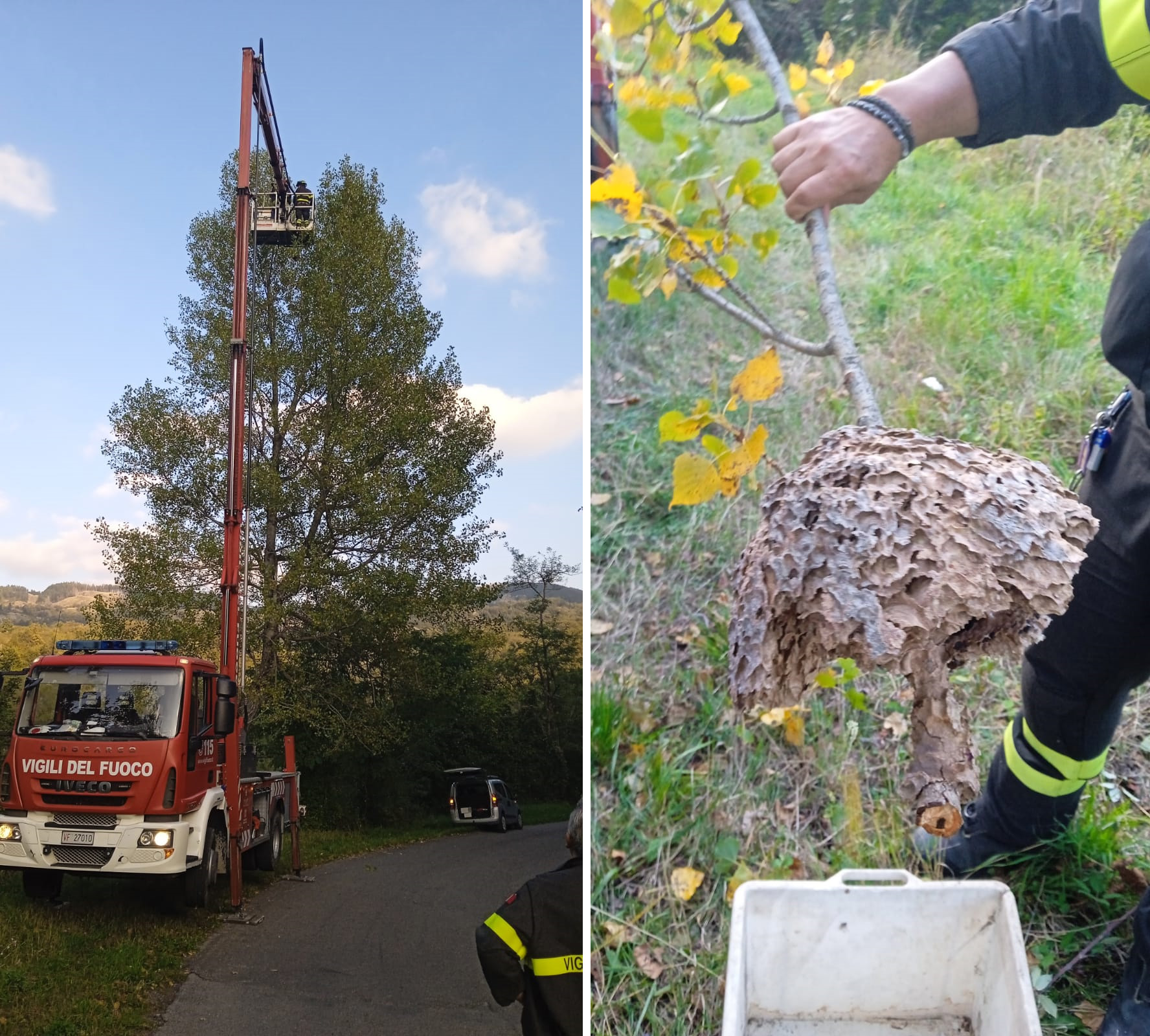 L’intervento di rimozione è avvenuto a settembre 2023 (foto in basso); tuttavia durante l’estate il nido era stato colpito dalle fucilate di alcuni cacciatori, pertanto al momento dell’intervento da parte dei Vigili del Fuoco, erano rimasti solo alcuni frammenti (foto in basso) dai quali è stato difficile pervenire ad una identificazione certa.